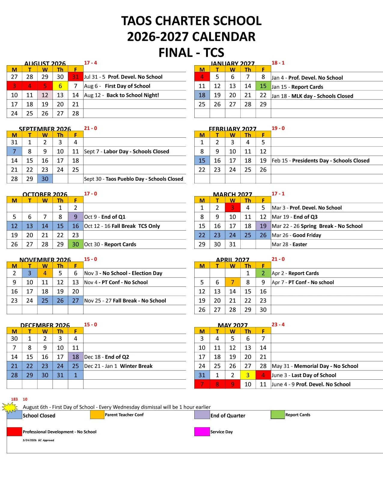 The 2026-2027 calendar is pending PED approval.
